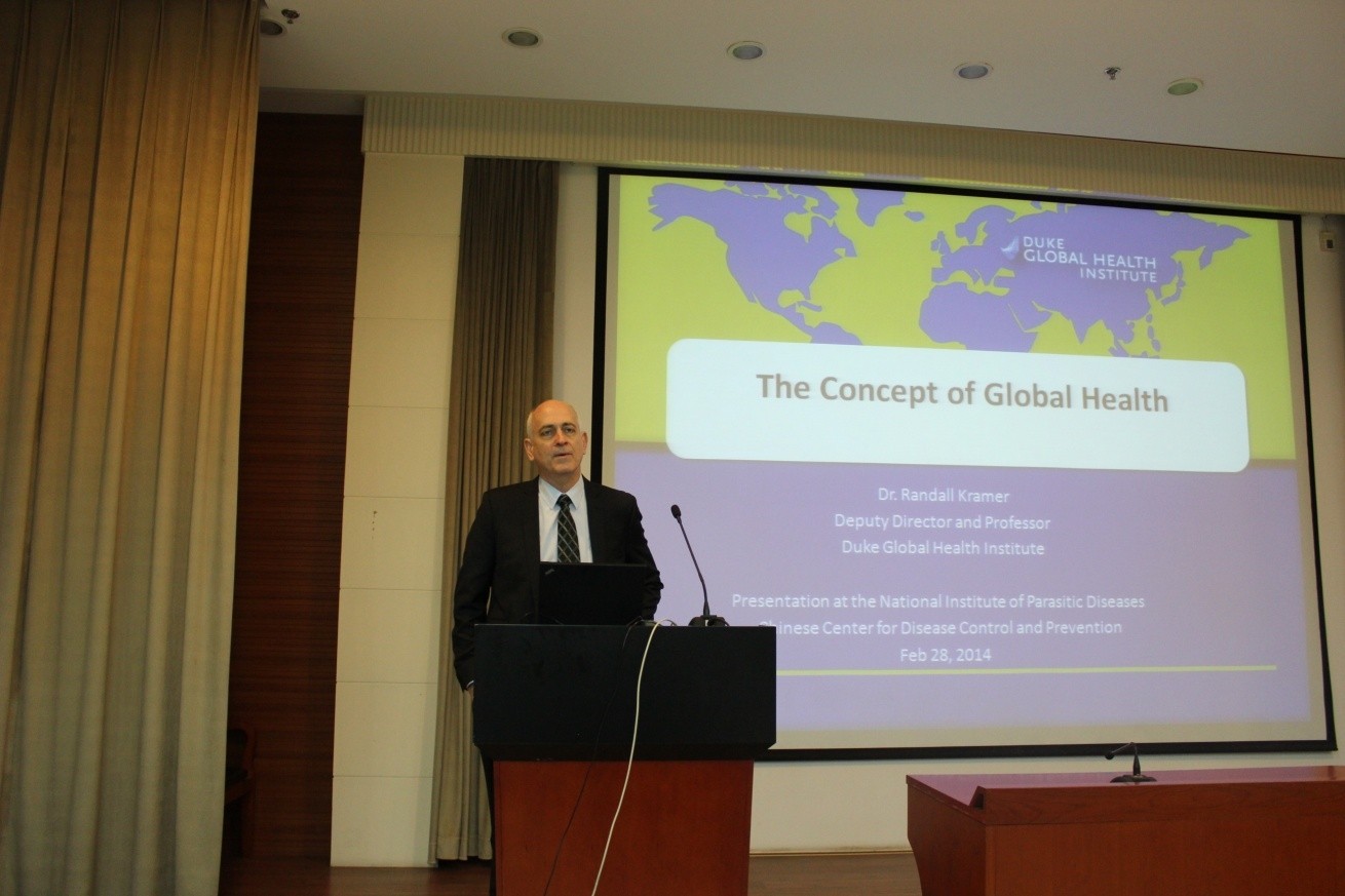 杜克大学全球卫生研究所副主任Randall Kramer教授于2014年2月27日—28日访问了寄生虫病所。2月27日上午,Randall Kramer教授访问了我所药物室、重点实验室和媒介标本馆。他饶有兴趣地询问了我所研制抗寄生虫药物、开展巴贝虫等分子生物学研究的进展,对我所取得的成就表示赞赏。2月28日,在我所召开的中英卫生支持项目启动会上,作为项目合作伙伴,Kramer教授应邀作题为“全球卫生概念”的演讲。Kramer教授的演讲分为三部分。第一部分介绍了“全球卫生”(Global Health)概念的定义和由来,阐述全球疾病负担和主要疾病类型、当今世界在卫生领域所面临的挑战引入全球卫生的重要性和必要性。第二部分从联合国千年发展计划目标(MDGs)和卫生发展援助(DAH)为切入点,回顾了金砖国家(BRICs)在全球卫生领域发挥的作用。第三部分中,Kramer教授介绍了杜克大学以及全美国大学在全球卫生领域设立的机构和领域内工作开展情况,并介绍了在我国设立的杜克昆山大学全球卫生专业概况。